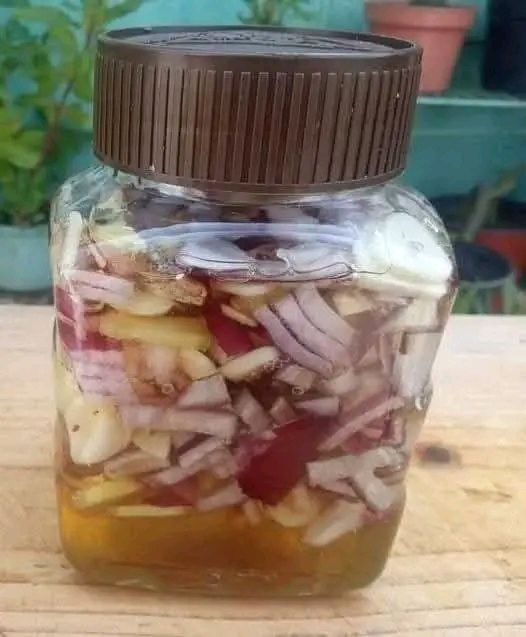 Jengibre rallado, cebolla, ajo, jugo de limón y miel. Una cucharada