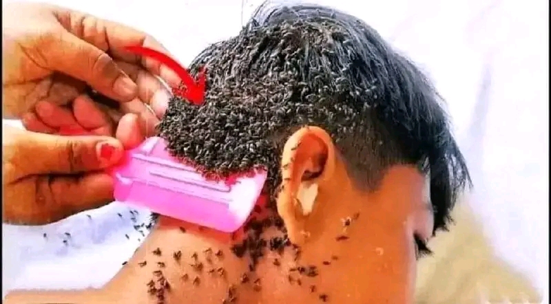 El niño llora del dolor en la cabeza, cuando su madre mira su cabello llamo a emergencias